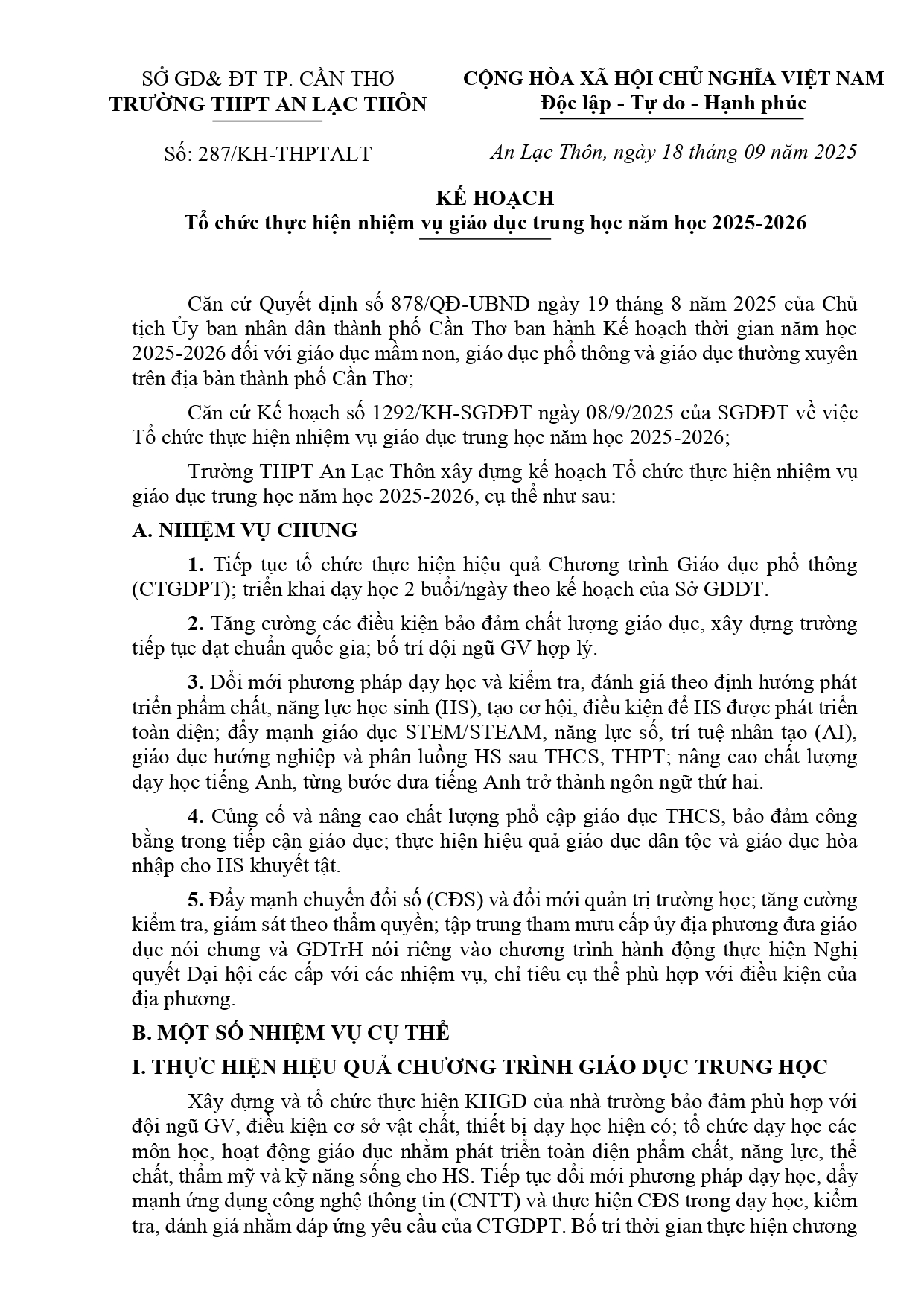 KẾ HOẠCH Tổ chức thực hiện nhiệm vụ giáo dục trung học năm học 2025-2026
