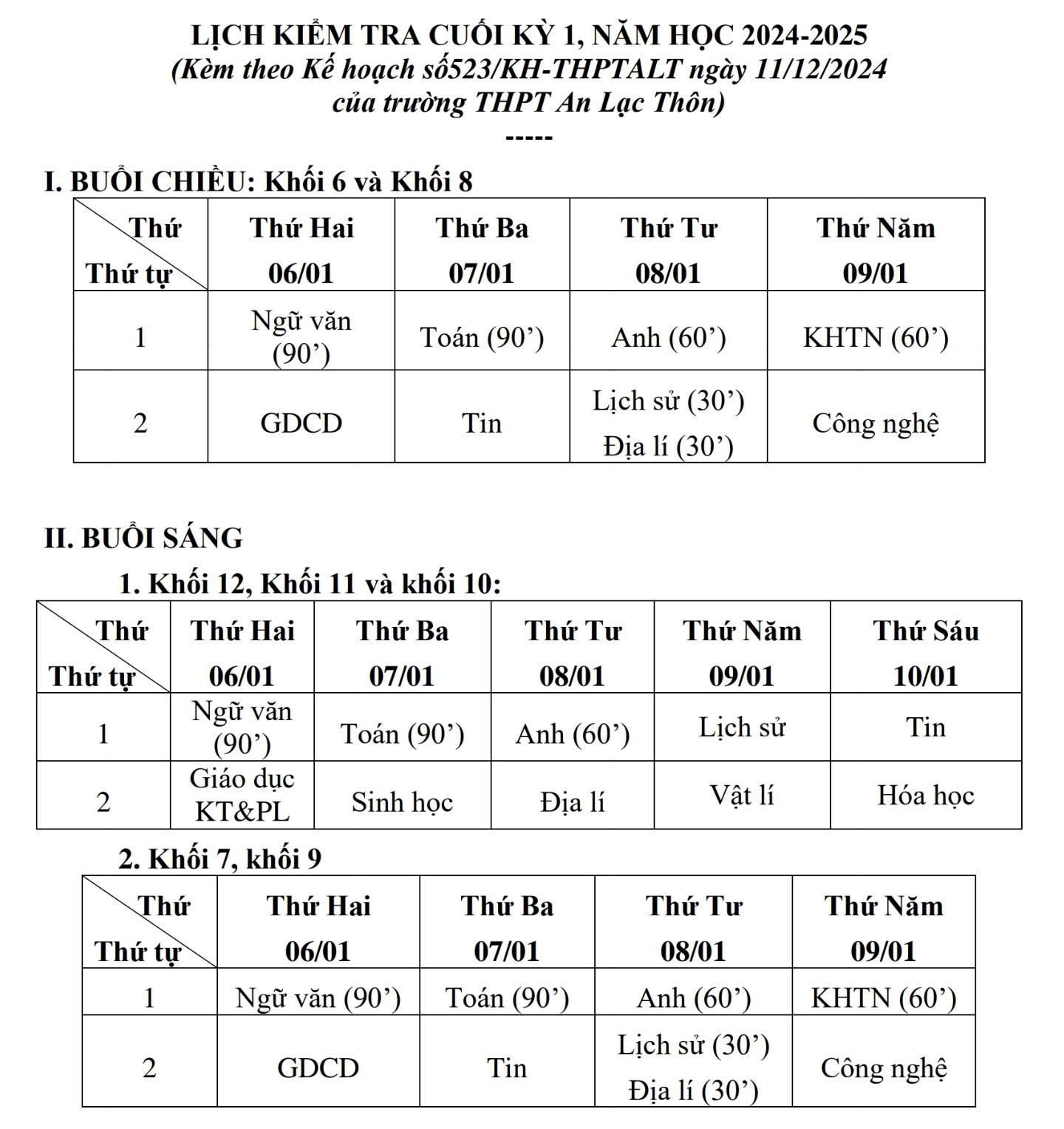 Lịch kiểm tra cuối kì 1 năm học 2024-2025